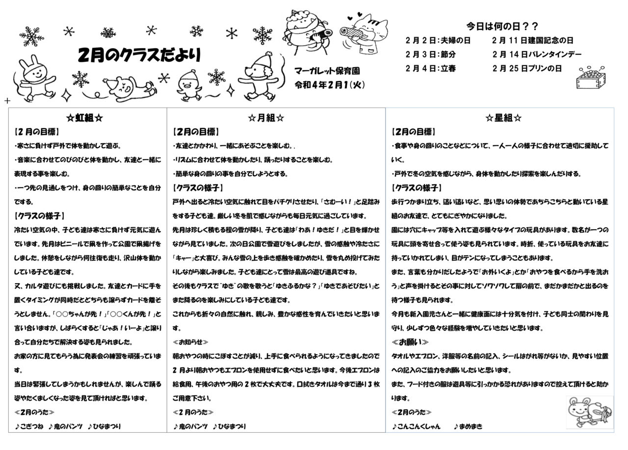 朝おやつの時にこぼすことが減り、上手に食べられるようになってきましたので2月より朝おやつもエプロンを使用せずに食べたいと思います。今後エプロンは給食用、午後のおやつ用の2枚で大丈夫です。口拭きタオルは今まで通り3枚ご用意下さい。