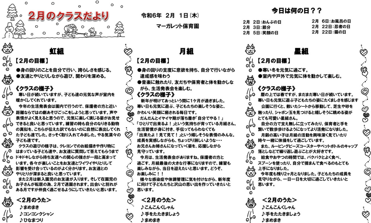 また2月は新入園児のお友達が入ります。そして在園児のお子さんが転居の為、2月で退園されます。出会いと別れがある月ですが仲良く過ごせるようにしていきたいと思います。