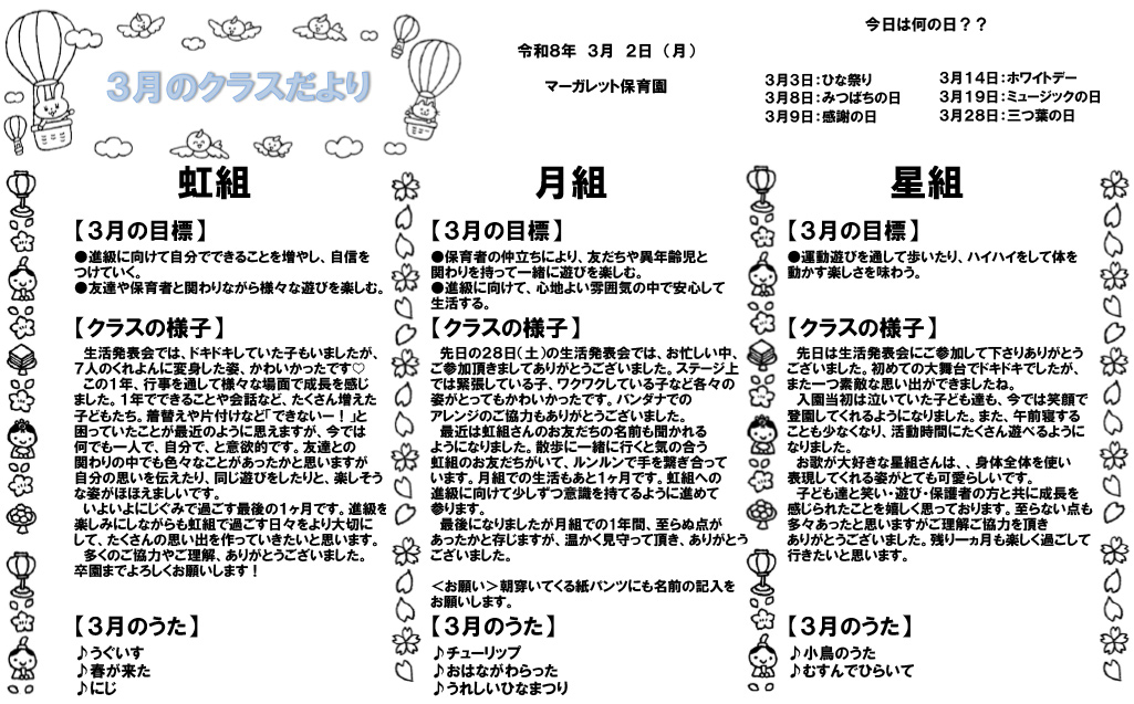 いよいよにじぐみで過ごす最後の1ヶ月です。進級を楽しみにしながらも虹組で過ごす日々をより大切にして、たくさんの思い出を作っていきたいと思います。
