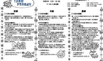 虹組 【12月の目標】 ・身の回りのことを意欲的に行い、達成感を味わう ・友達と一緒に身体を動かして遊び、寒い冬を元気に過ごす 【クラスの様子】 急に寒くなり、...