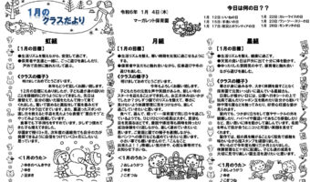 虹組 【1月の目標】 ・生活リズムを整えながら、安定して過ごす。 ・保育者や友達と一緒に、ごっこ遊びを楽しんだり、戸外で自然に触れたりして遊ぶ。 【クラスの様子...
