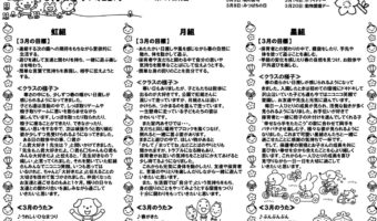 虹組 【3月の目標】 ・進級する次の園への期待をもちながら意欲的に生活する。 ・遊びを通して友達と関わりを持ち、一緒に遊ぶ楽しさを味わう。 ・簡単な言葉で気持ち...