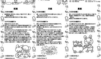 虹組 【4月の目標】 ・保育者に見守られ、安心して過ごす中で、新しい環境に慣れる。 ・自分の好きな遊びを見つけて楽しく遊ぶ。 【クラスの様子】 進級おめでとうご...