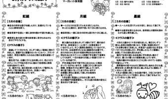 虹組 【5月の目標】 ・自分の好きな遊びを楽しんだり、友達のしていることに興味を持つ。 ・保育者や友達と一緒に身体を動かす遊びを楽しむ。 ・簡単な身の回りの事を...